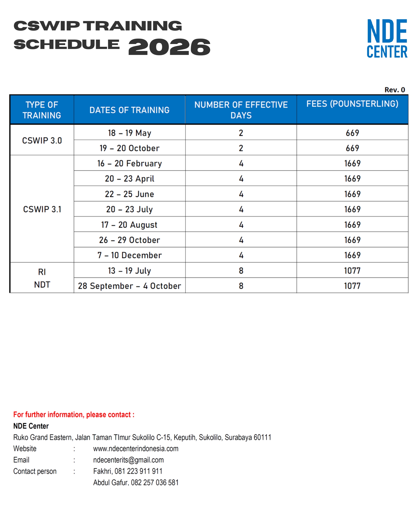 NDE Center CSWIP 2026 Training Schedule